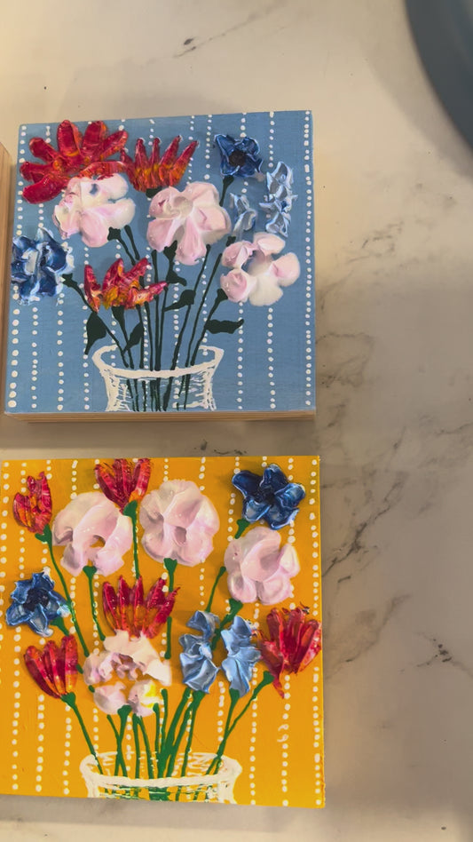 Multicolored flowers on blue Background- 8x8 painting on wood panel
