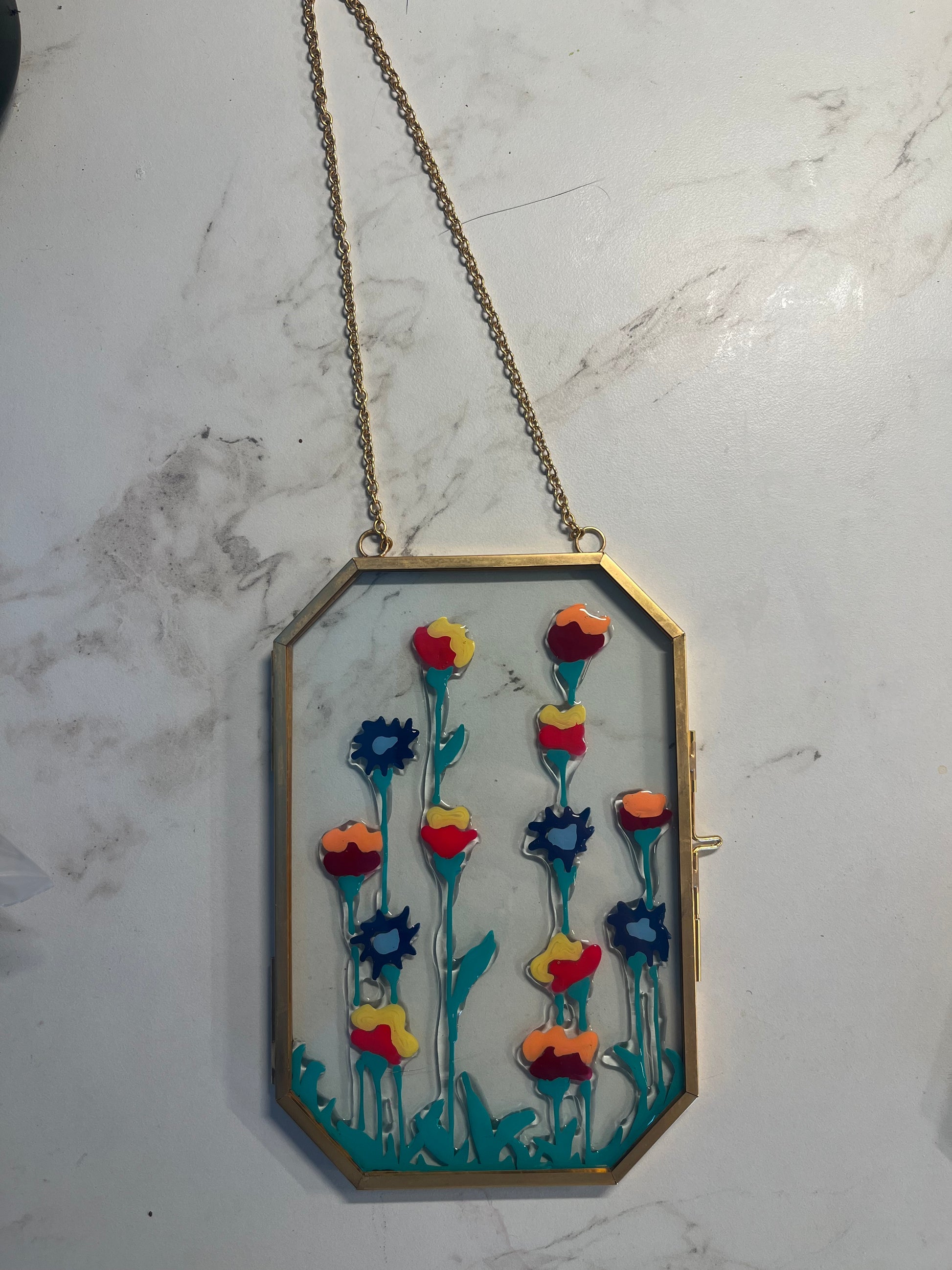 - The painting is painted directly inside the double pane of glass, and coated in resin to prevent chipping.